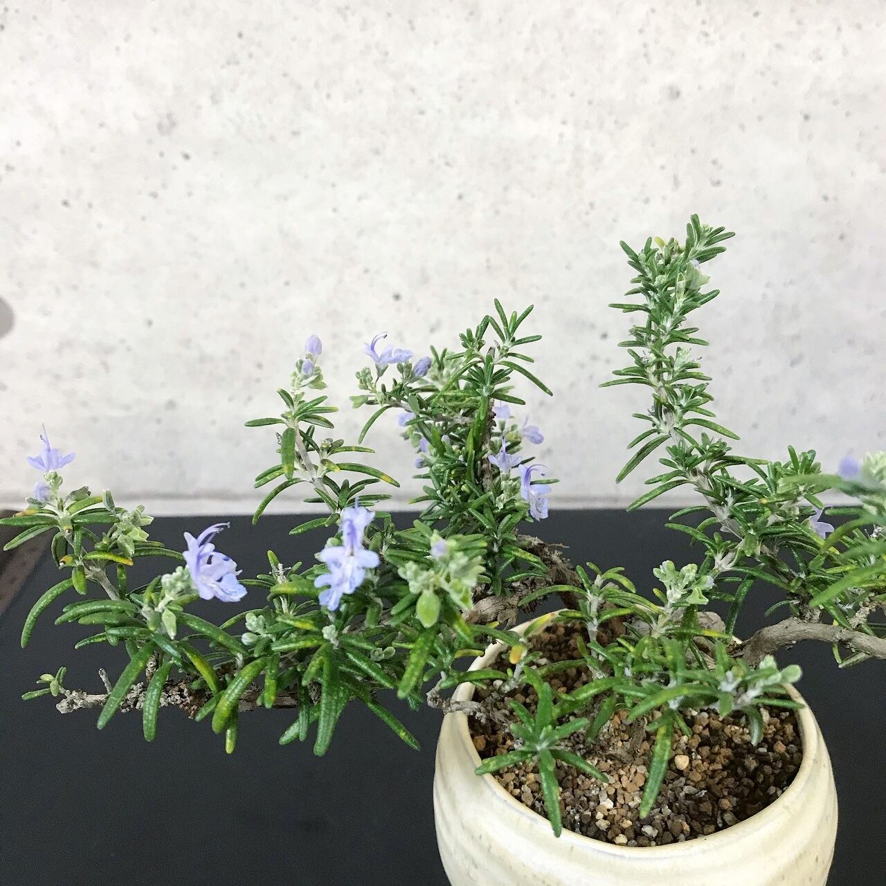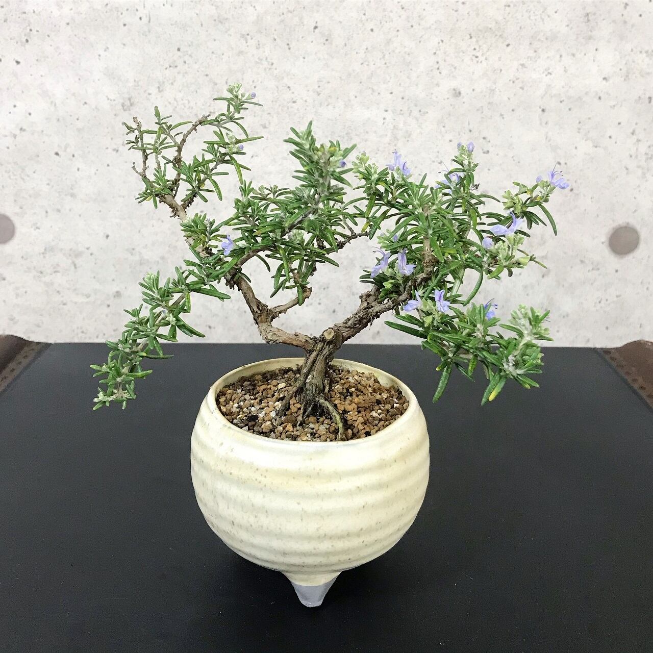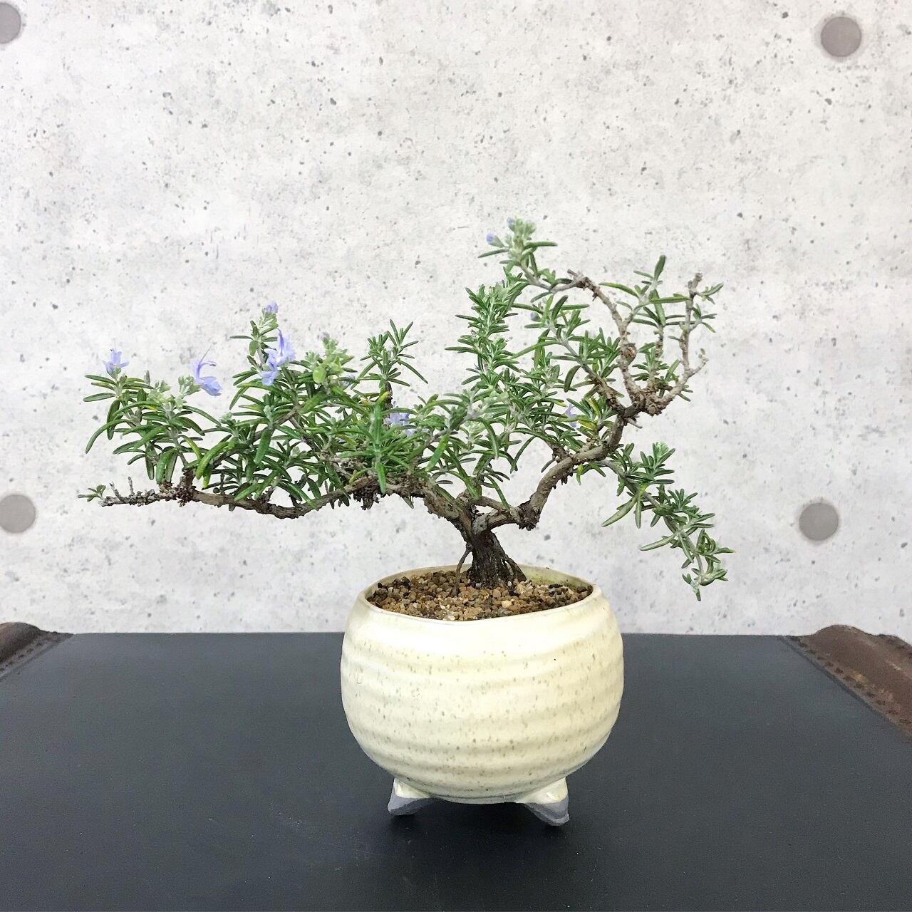 ハーブ独特の芳香豊かな濃緑色の葉と、幹と枝の表情が面白いローズマリーを、個性的な盆栽に仕立てました。